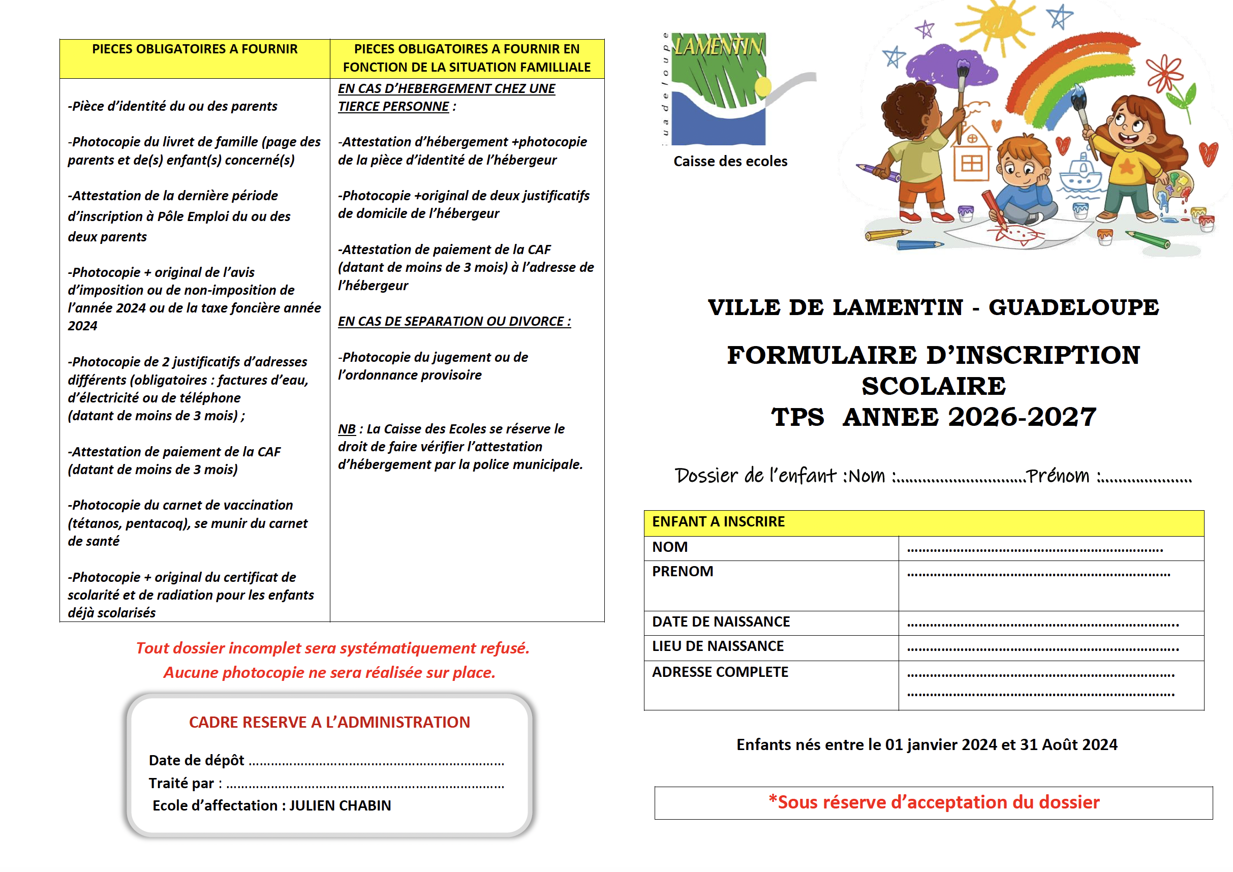 La Ville de Lamentin informe les parents de l’ouverture de la campagne d’inscriptions scolaires en écoles maternelles (TPS à GS) pour la rentrée 2026/2027.