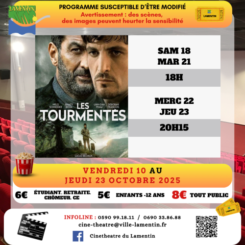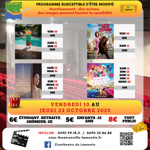 Retrouvez ci-dessous le programme du vendredi 10 au jeudi 23 octobre 2025 au Ciné théâtre de Lamentin.