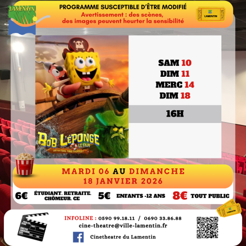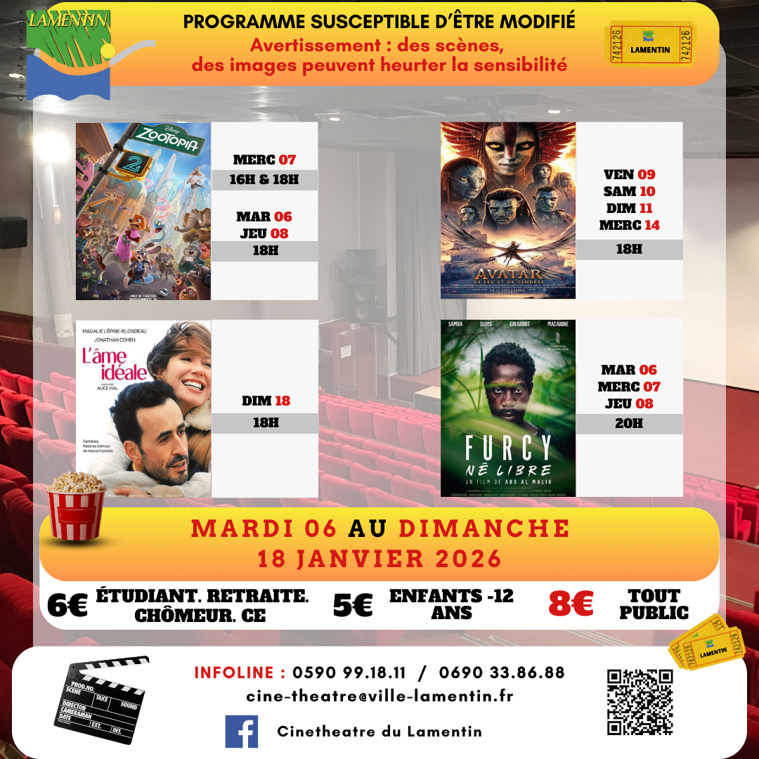 Retrouvez ci-dessous le programme du mardi 06 au dimanche 18 janvier 2026 au Ciné théâtre de Lamentin.