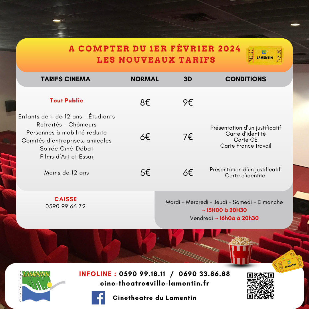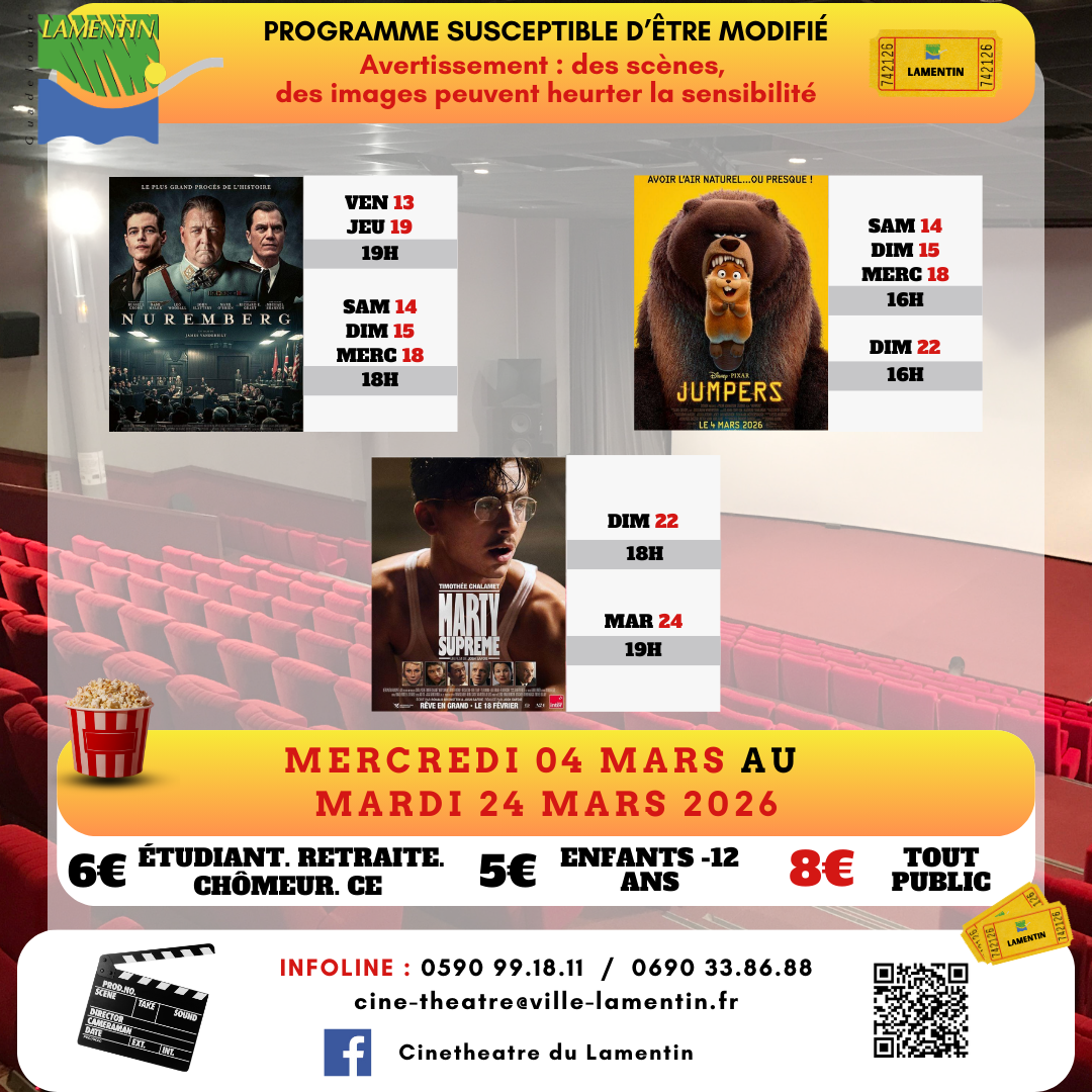 Retrouvez ci-dessous le programme du mercredi 04 au mardi 24 mars 2026 au Ciné théâtre de Lamentin.