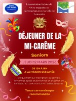 L’association La Joie de Vivre, en partenariat avec la Ville, vous invite à célébrer la Mi-Carême lors d’un grand déjeuner festif qui se tiendra le jeudi 12 mars 2026, de 12h à 18h, à la Maison des Aînés.