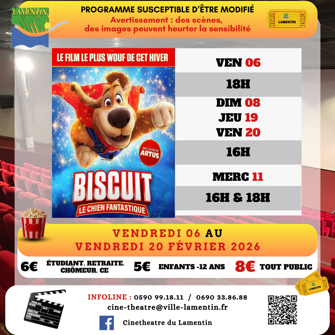 Retrouvez ci-dessous le programme du mercredi 21 janvier au jeudi 05 février 2026 au Ciné théâtre de Lamentin.